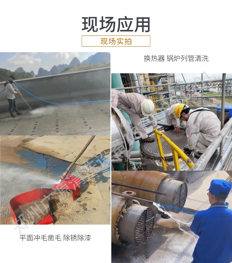应用范围:广泛应用于市政设施维护(如路面、桥梁、下水道清洗)、重工业生产环境(如化工厂、炼油厂、钢铁厂等设备清洗)、交通运输业(如汽车修理厂、铁路车辆清洗)、建筑行业(如混凝土模板清洗、建筑物外墙清洗)以及特殊场合的顽固污渍清除(如大型管道疏通、矿山机械除锈等)。
