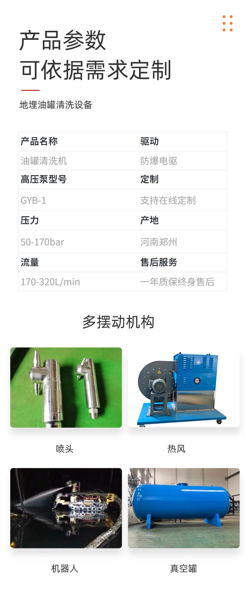 立式储油罐清洗设备则可能更为大型和复杂,因为大型储油罐体积庞大,内部结构可能更复杂,要求设备有更高的清洗效率和覆盖范围。