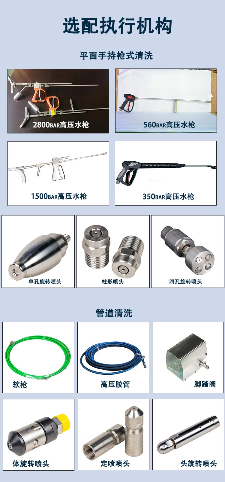 各种喷嘴: 扇形喷嘴(大面积冲洗)、旋转喷嘴(去硬垢)、零度喷嘴(定点清除)等。