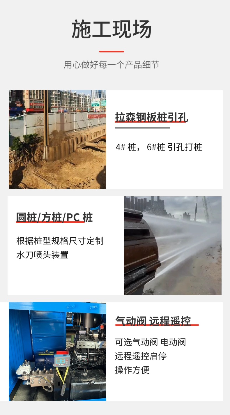 下沉贯入:在高压水流冲刷的同时,启动振动锤(或打桩锤),在轻微的高频振动和下压力的作用下,钢板桩凭借自重和设备压力顺势沉入被水刀预切割的孔洞中。