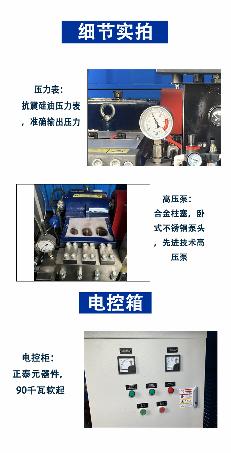 核心高压泵采用德国KAMET技术,卧式不锈钢泵头搭配不锈钢镀镍合金柱塞,耐磨损、抗腐蚀性能远超普通金属部件,配合强制水冷降温系统,可控制连续作业时的泵体温度,即使在40℃以上的高温环境中也能稳定运行,泵体寿命较行业常规产品提升30%。高压泵箱体选用球墨铸铁材质,质地坚硬不易变形,动力端采用飞溅润滑或强制润滑技术,传动平稳且摩擦系数极低,进一步减少部件损耗。