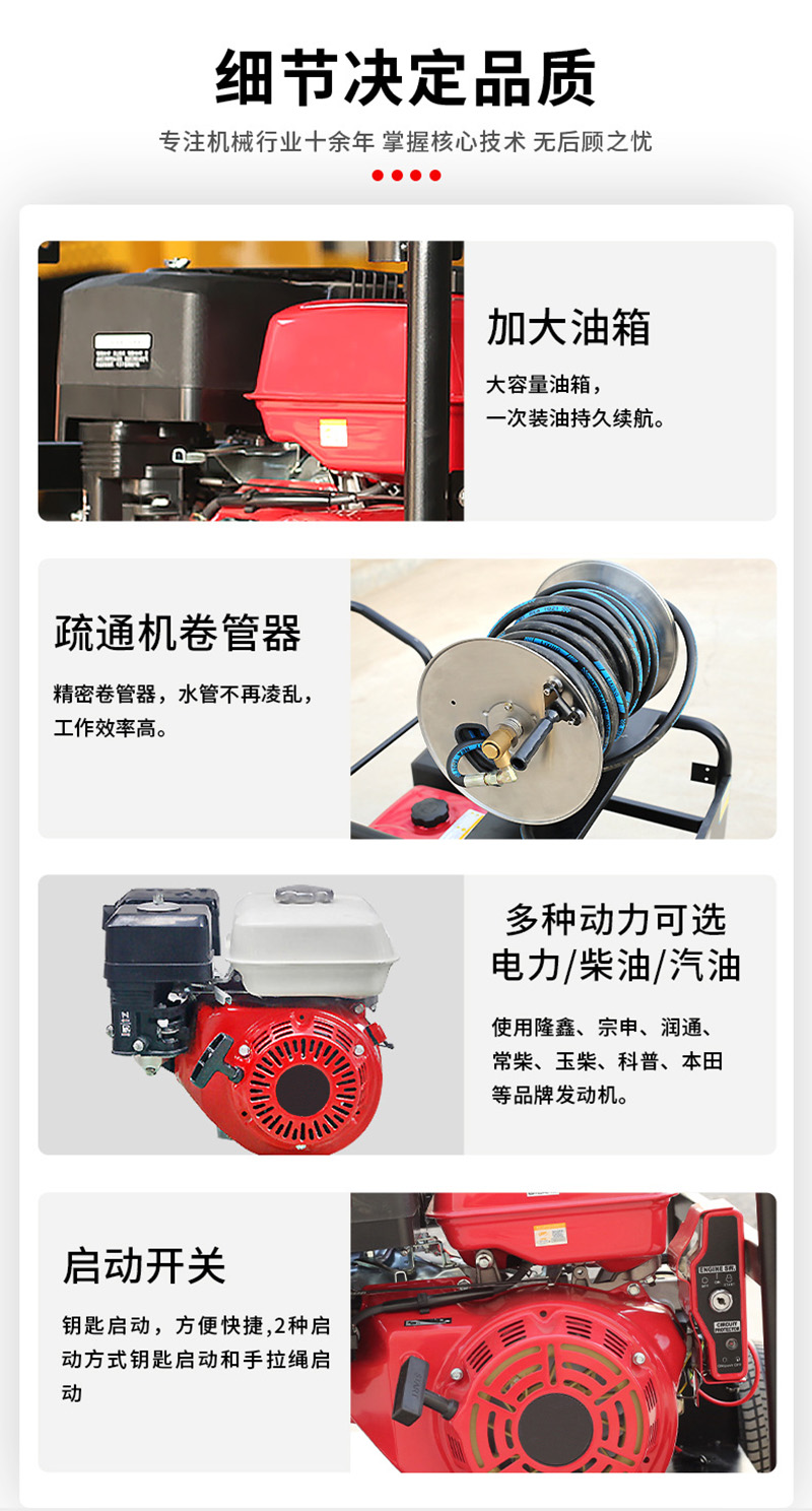 下水道清洗机疏通机用于疏通和清除管道中的严重堵塞物和污垢。高压柱塞泵由汽车发动机驱动。利用高压水射流产生的反作用力,带动喷嘴带动橡胶管在管路中向前运动,清除管路中的污垢。当喷水器到达管道的另一端时,橡胶管在卷盘张力的作用下被迫向后移动。此时,高压水射流扫管壁,将管外杂物带走,达到清洗管道的目的。